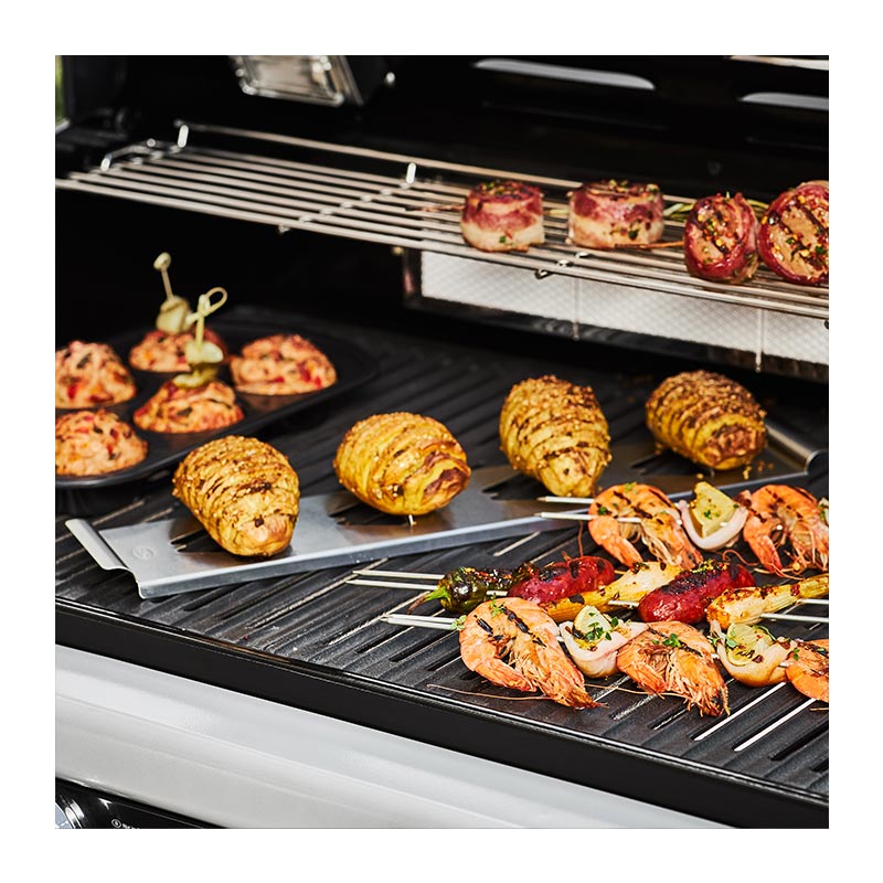 Arka arkaya dörtlü: Pratik patates tutacağı, içten dışa eşit şekilde pişmeleri için dört büyük yumruya kadar yer sunar. Bunun için patatesler daha sonra ızgara üzerinde yuvarlanmaması için 18/10 paslanmaz çelik tutucuya şişlenir. Yanlardaki iki tutamak da taşıma sırasında güvenli bir tutuş sağlar. Tutucu, 47 cm veya daha büyük çaplı herhangi bir ızgarada kullanılabilir.