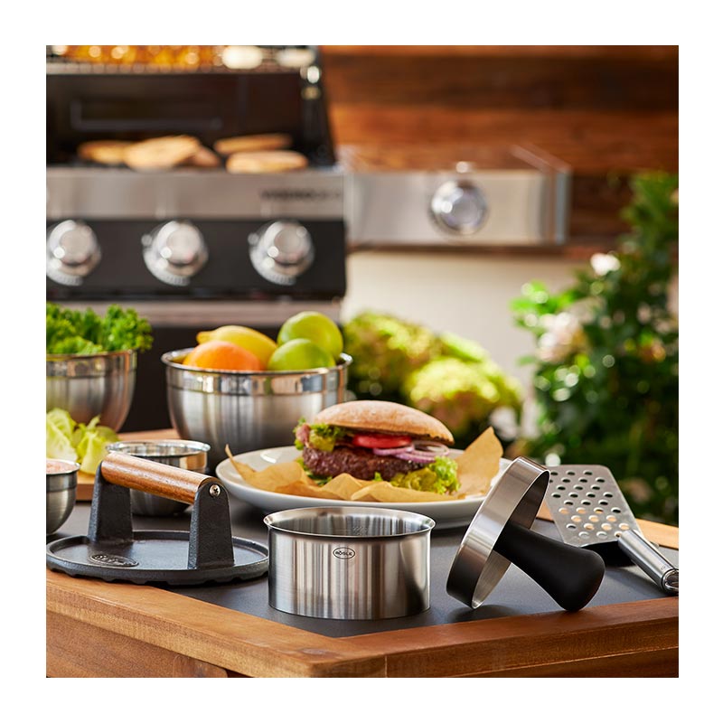 Kaşe ve halkadan oluşan paslanmaz çelikten burger presi. Köftelerin hızlı ve kolay şekillendirilmesi için (100 - 300 gr). Halka çapı 11 cm, halka yüksekliği yaklaşık 6 cm. Standart ve XL hamburger ekmeğine uygun köfteler.