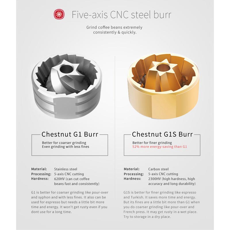Timemore Chestnut, metal gövde, ahşap ve plastik hazne ile işlevsellik ve sağlam formu mükemmel bir şekilde birleştiren bir el öğütücüsüdür. Modern tasarımı 2017 RedDot Ödülü'nü kazandı.