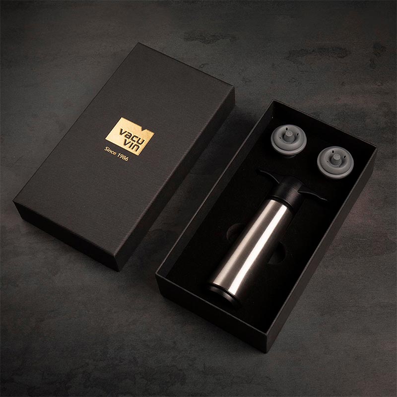 Vacu Vin Şarap Vakum Seti, Paslanmaz Çelik (1 Pompa, 2 Tıpa), Hediye Kutulu, lüks bir hediye kutusunda sunulur ve içerisinde iki adet yeniden kullanılabilir tıpa bulunur. Bu set, şarap severler için ideal bir hediye seçeneğidir ve şarap deneyimini tamamlayıcı bir aksesuardır.