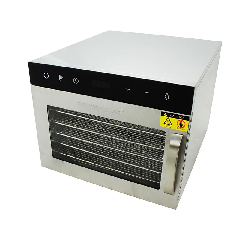 Wartmann WM2206 paslanmaz çelik gıda kurutma makinesi ile sebze veya meyve kurutma işlemi oldukça kolaydır. Temizlenmiş ve eşit dilimlenmiş gıdaları tepsiye yerleştirin, sonra kurutma derecesini ve süresini dijital kontrol panelinden ayarlayarak kurutmaya başlayın. Kurutma sürecini can kapak bölümünden kontrol edebilir ve istediğiniz kurulukta olan gıdaları çıkardıktan sonra uzun süre güvenle saklayabilirsiniz.Paslanmaz çelik malzeme sayesinde temizliği kolaydır. Nemli bir bezle silerek kolaylıkla rutin temizliğin üstesinden gelebilirsiniz. Ayrıca alt kısımdaki kırıntı bölmesi bakımı pratikleştirir. WH2206 ile uzun ömürlü, besleyici ve lezzetli kurutulmuş gıdalar elde edebilirsiniz.Tüm Wartmann kurutucular gibi WM-2206-DH gıda kurutma makinesi de aşırı ısınmaya karşı koruma sunar ve sıcaklık 100 santigrat dereceye ulaştığında otomatik olarak kapanır.