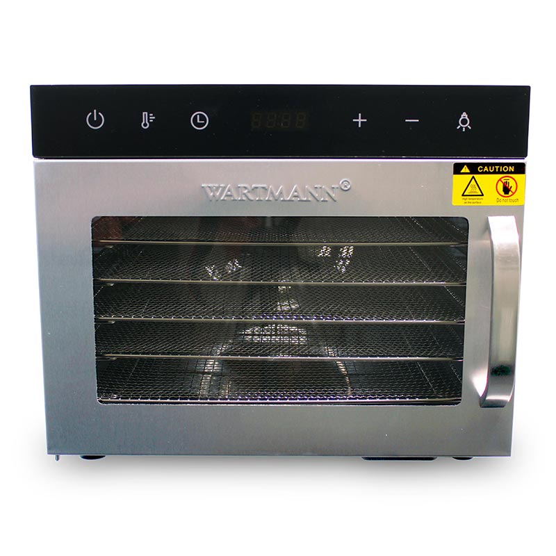 Wartmann WM2206 paslanmaz çelik gıda kurutma makinesi ile sebze veya meyve kurutma işlemi oldukça kolaydır. Temizlenmiş ve eşit dilimlenmiş gıdaları tepsiye yerleştirin, sonra kurutma derecesini ve süresini dijital kontrol panelinden ayarlayarak kurutmaya başlayın. Kurutma sürecini can kapak bölümünden kontrol edebilir ve istediğiniz kurulukta olan gıdaları çıkardıktan sonra uzun süre güvenle saklayabilirsiniz.Paslanmaz çelik malzeme sayesinde temizliği kolaydır. Nemli bir bezle silerek kolaylıkla rutin temizliğin üstesinden gelebilirsiniz. Ayrıca alt kısımdaki kırıntı bölmesi bakımı pratikleştirir. WH2206 ile uzun ömürlü, besleyici ve lezzetli kurutulmuş gıdalar elde edebilirsiniz.Tüm Wartmann kurutucular gibi WM-2206-DH gıda kurutma makinesi de aşırı ısınmaya karşı koruma sunar ve sıcaklık 100 santigrat dereceye ulaştığında otomatik olarak kapanır.